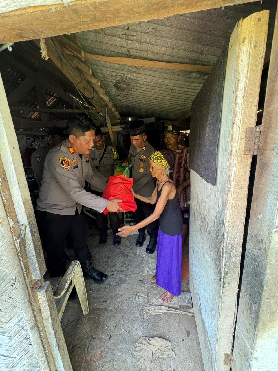 Dalam kunjungan tersebut, Kapolsek menyerahkan bantuan berupa paket sembako sebagai wujud perhatian kepada Nenek Lamih yang diketahui hidup sebatang kara dengan kondisi yang cukup memprihatinkan.