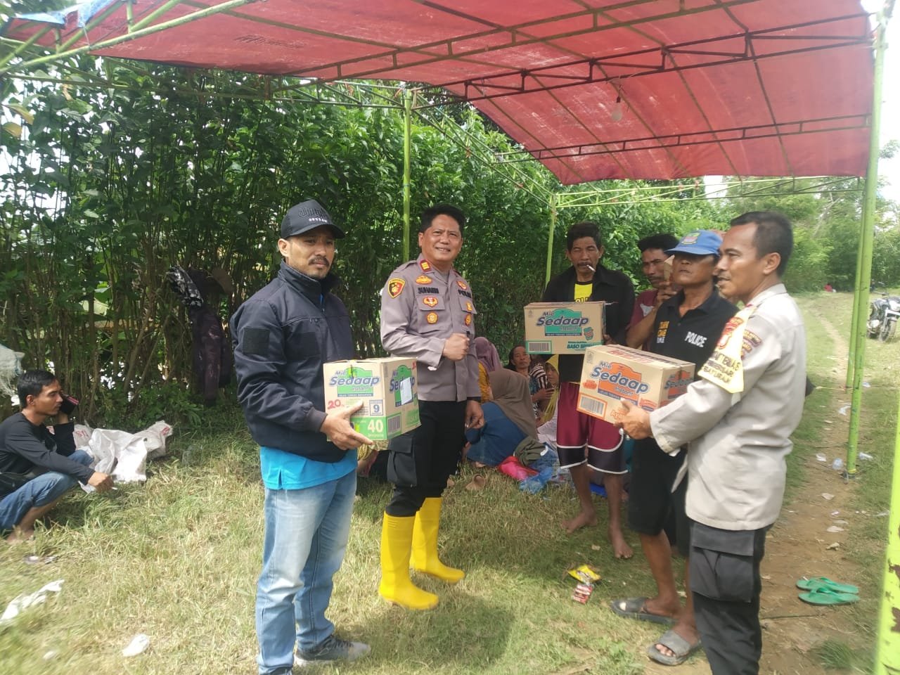 Kehadiran Kapolsek Pebayuran dalam kesempatan tersebut sekaligus memberikan bantuan kemanusiaan berupa beberapa dus mie instan kepada warga yang saat ini berada di tenda darurat pengungsian.